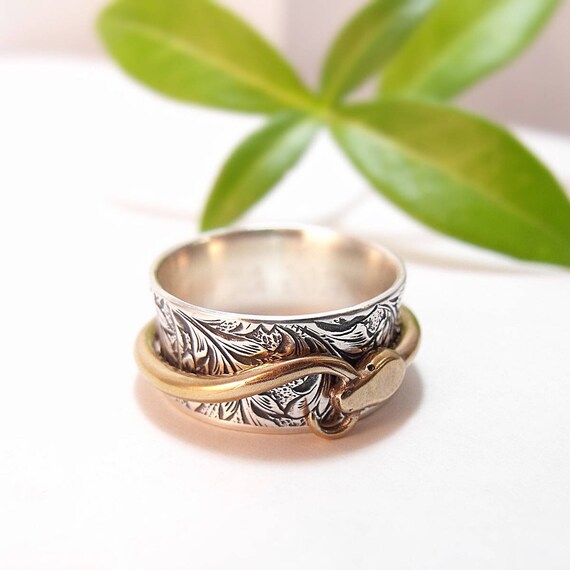 Questo argento serpente anello caratteristiche una banda interna ampia floreale 10mm (3/8") e un anello esterno a forma di un ouroboros..--un serpente che mangia la coda..--che gira liberamente la banda interna. Il serpente gira (si intrufola!) tutto il fogliame della banda larga, tenuto in posizione dalla estremità svasata di quella banda. Queste estremità svasate dare l'anello una vestibilità piacevole, confortevole; scivola sul dito.